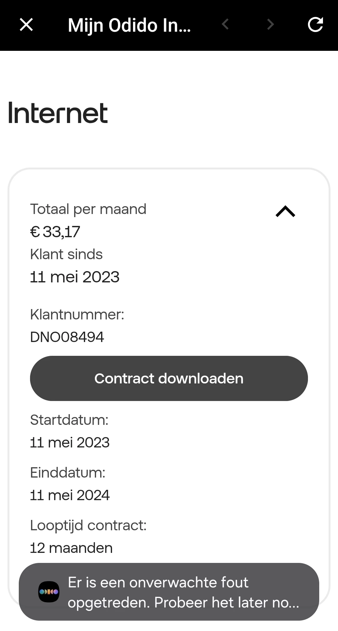 Wanneer ik Mijn Odido omgeving probeer mijn contract te downloaden, krijg ik steeds een foutmelding. "Later proberen" werkt ook niet. Android. Zie screenshot.