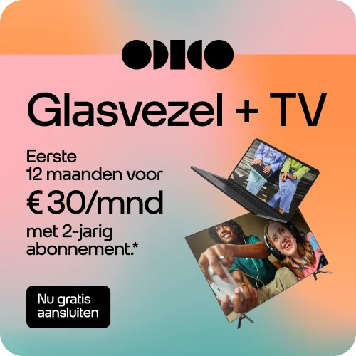 * Dit aanbod is geldig i.c.m. een Internet (tot max. 2 Gbit/s) + TV abonnement van 2 jaar en 1e Mediabox. Na de 1e 12 mnd. betaal je min. € 51,50/mnd (100 Mbit/s), afhankelijk van het type netwerk op jouw adres. Doe de postcodecheck en bekijk jouw aanbod + de voorwaarden op Odido.nl.
