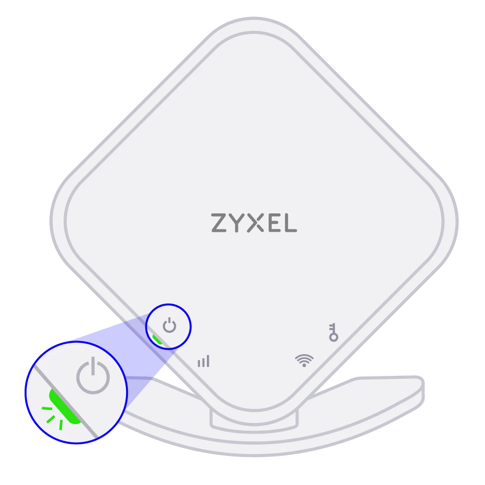 - Wacht totdat het wifipunt is opgestart en klaar is om te verbinden. Het wifipunt is opgestart zodra het Power-lampje groen blijft branden en het wifi-lampje groen knippert. Dit duurt maximaal vijf minuten, even geduld dus.