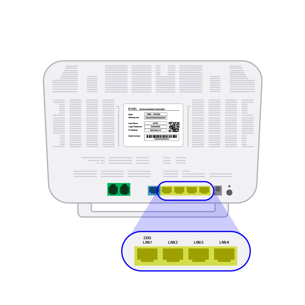 Neem de bijgeleverde internetkabel. Steek 1 uiteinde van de kabel in 1 van de 4 LAN-poorten van het modem.